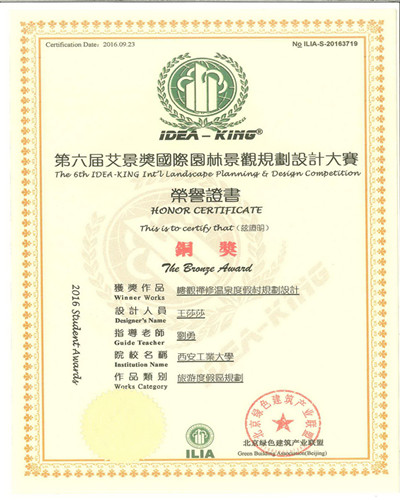 由国际园林景观规划设计行业协会(ILIA),北京林业大学教育基金会,北京绿色建筑产业联盟联合主办,厦门市政府协办的2016国际园林景观规划设计大会暨第六届艾景奖颁奖盛典近日在厦门国际会展中心举办。我院城乡规划系王莎莎同学的作品《楼观禅修温泉度假村规划设计》获得旅游度假区规划类景观设计铜奖,车维娜同学的作品《农韵——教稼园农业主题公园景观规划设计》获公园与花园设计类优秀奖。