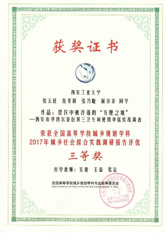 9月23日,在呼和浩特召开的“2017中国高等学校城乡规划教育年会”交流和评优环节中,我院报送的作品《景区中被冷落的“方便之地”——西安华清宫景区第三卫生间使用率低情况调查》获“城乡社会综合实践调研报告课程作业”三等奖。