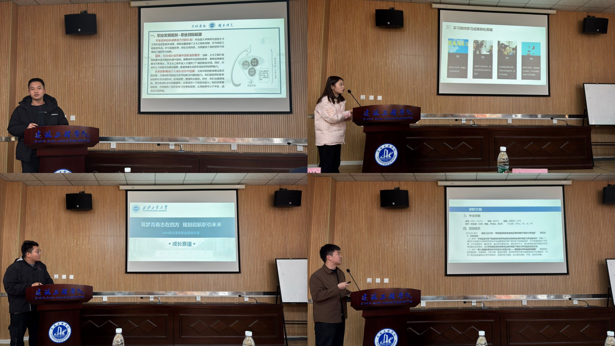 在就业赛道展示环节中,选手们分别围绕自身实践经历、岗位能力、发展潜力等方面陈述个人求职意向和职业准备情况,对自身优劣势进行深入剖析,并对自己的职业方向进行大胆探索。在成长赛道展示环节中,选手们结合生涯发展报告,围绕自我认知、职业认知、计划与路径、评估与调整等方面对自己的职业生涯规划理念进行陈述。