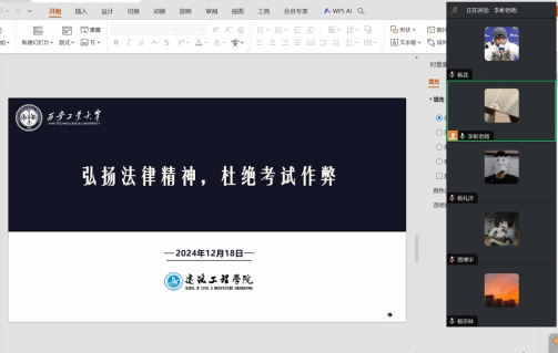毕业班辅导员李彬以“弘扬法律精神,杜绝考试作弊”为主题,领学了考试的相关法律法规,着重强调了考试作弊的严重后果;同时以考研报考数据和实际案例,为同学们提供了一系列实用的心理调适技巧;针对考试信心、作息、饮食以及细节,给同学们提出了相应的建议。