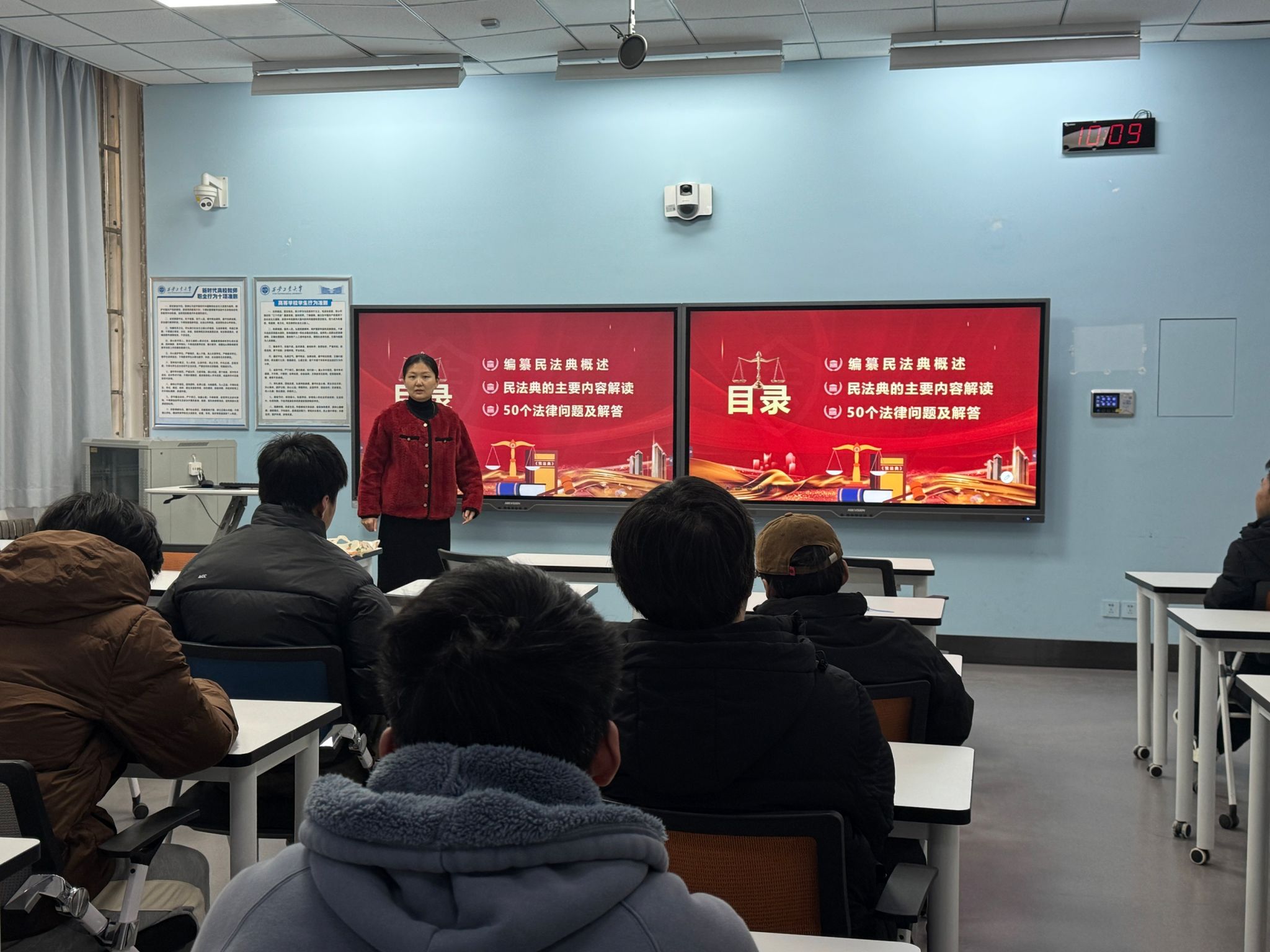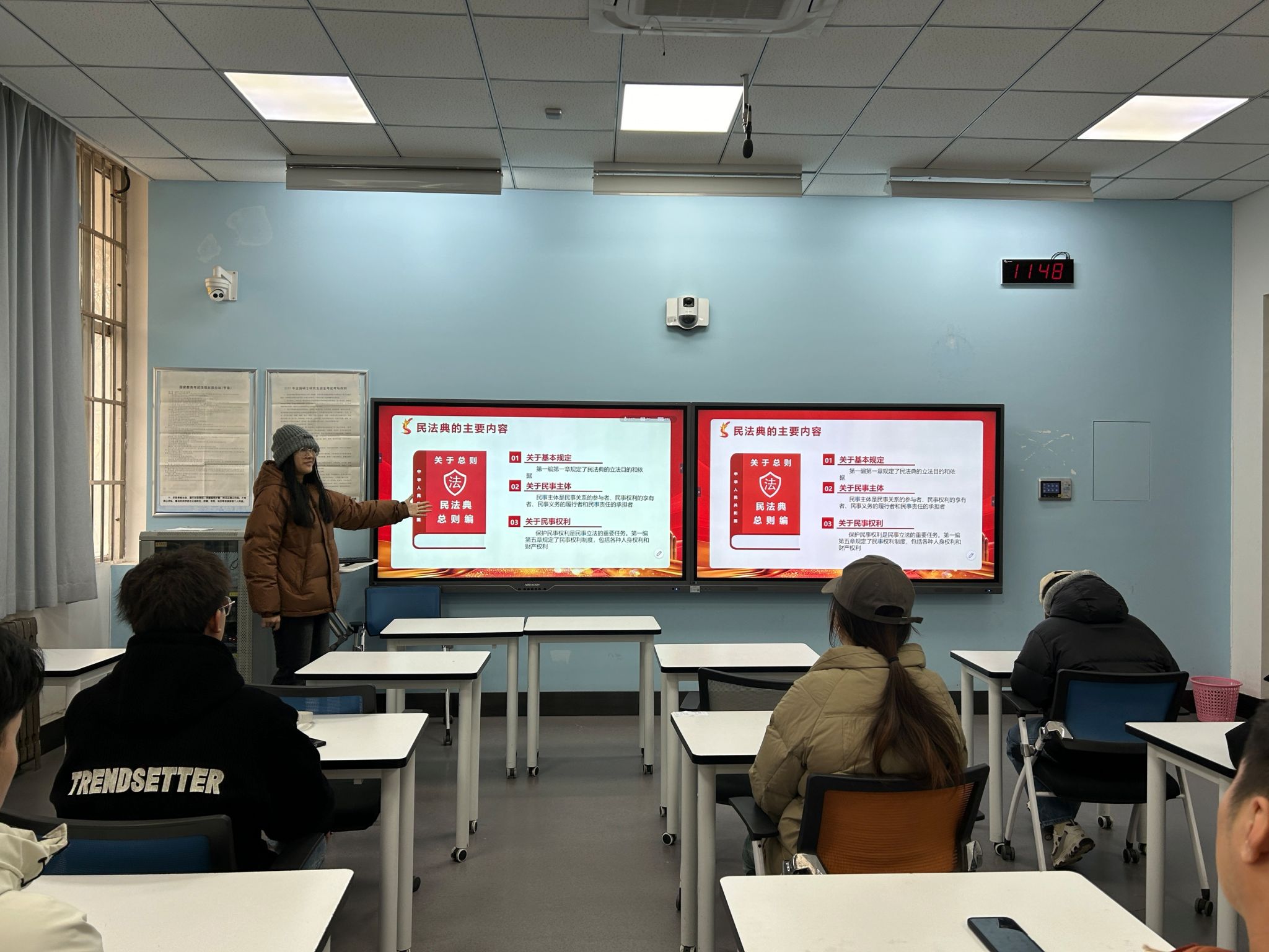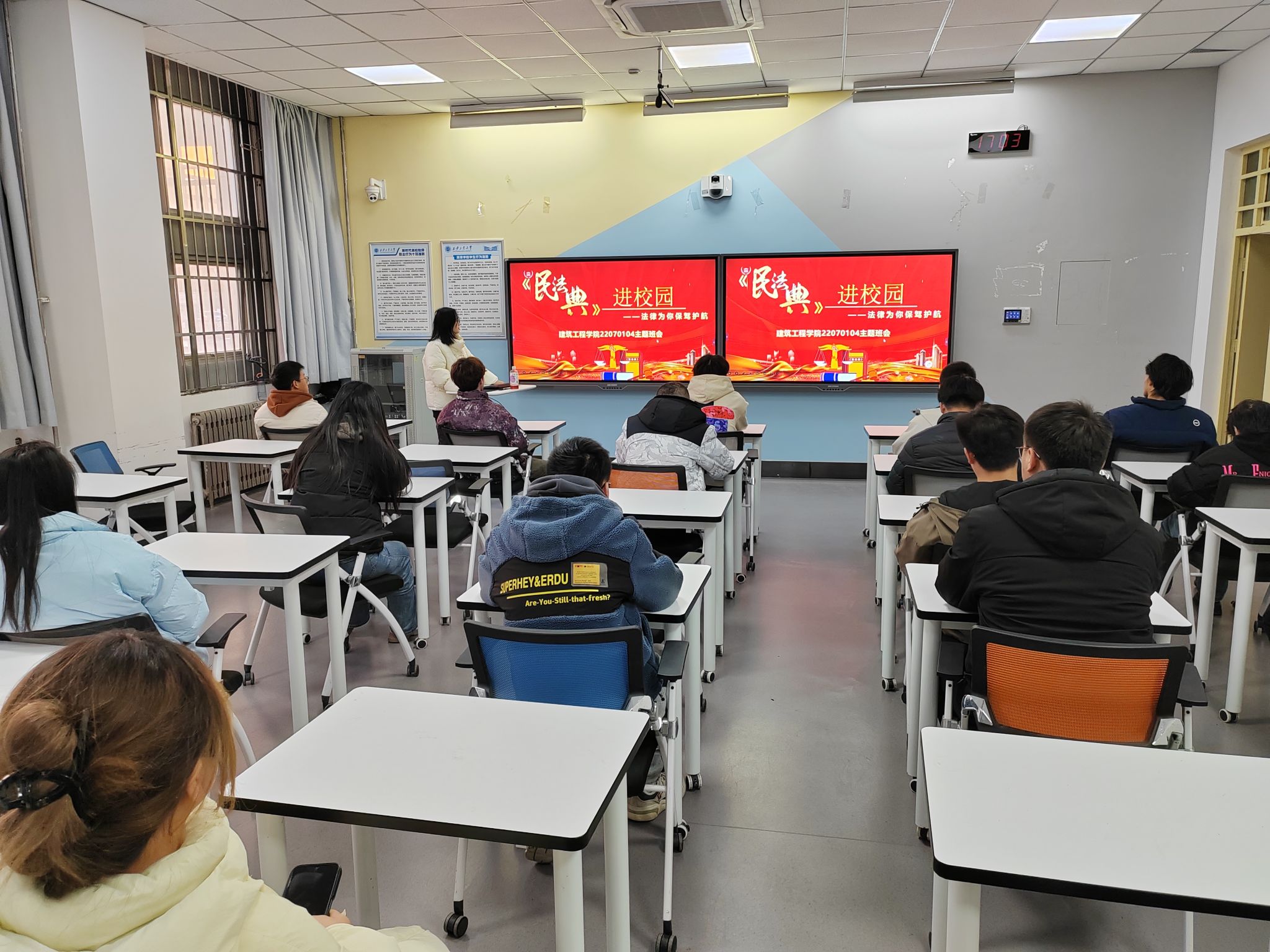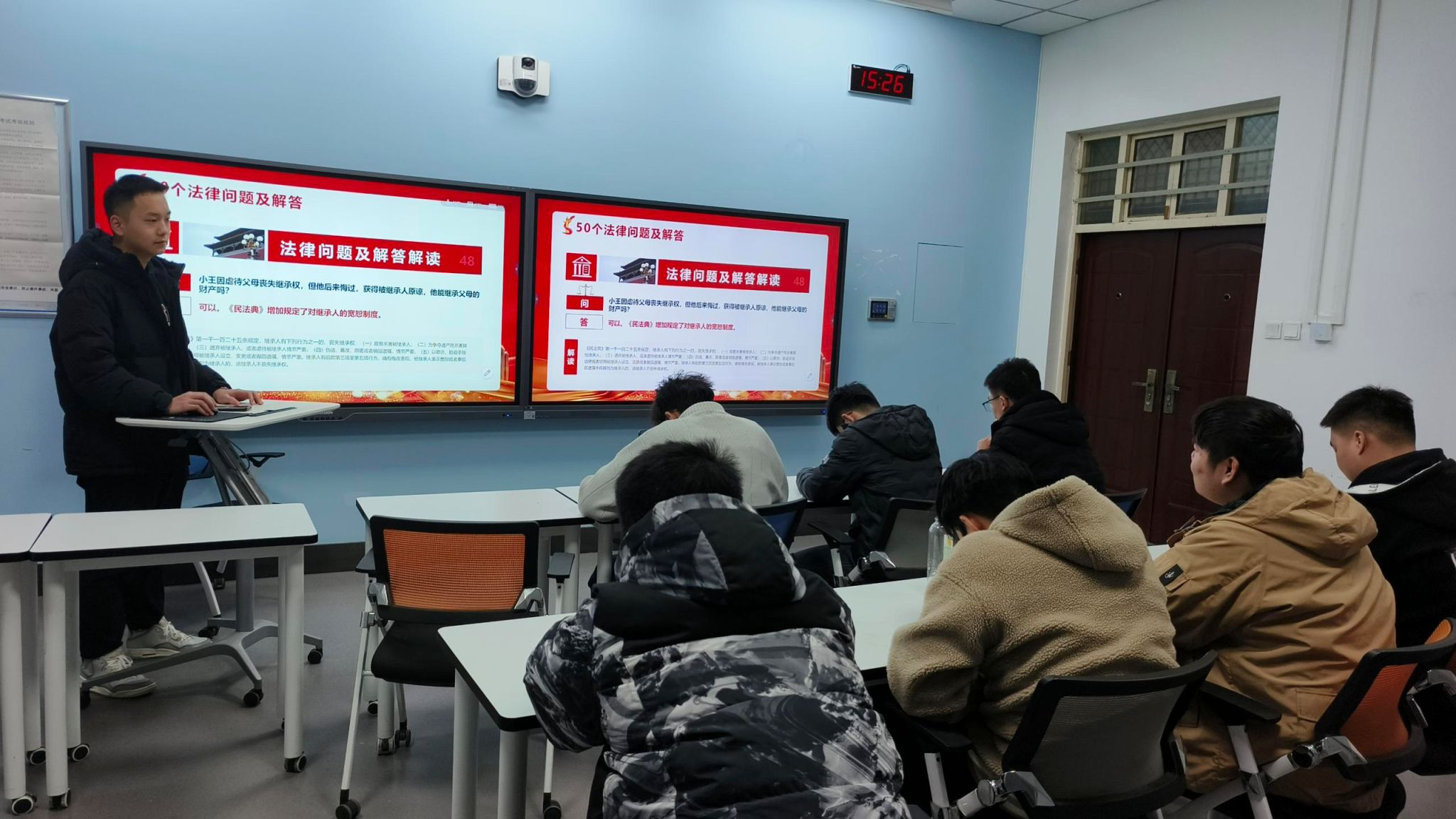当大会的警示余音还在耳畔回响,各班教室随即开启了一场场热烈的民法典主题班会。12月19日-12月23日各班班长以校园生活为蓝本,用通俗易懂的话语将法典条文拆解,让同学们领悟到这部“社会生活百科全书”的魅力与实用。在欢声笑语与激烈讨论中,民法典不再是束之高阁的法条汇编,而是成为同学们应对生活挑战的得力指南。