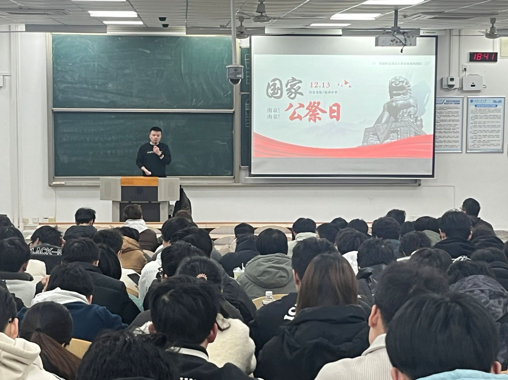 会上,刘冬结合一二九运动、国家公祭日等重要时间节点,采用PPT向同学们讲述了“一二·九”运动的历史背景、经过及意义,国家公祭日的设立初衷和深远影响,以及众多在革命战争中英勇牺牲的英雄人物事迹等,借助生动的讲述、丰富的图片以及感人的视频,将那段尘封的历史故事重新展现在大家眼前。刘冬强调,青年是新时代的追梦人,承载着祖国的未来与希望,一定要把爱国主义精神牢牢扎根于心。