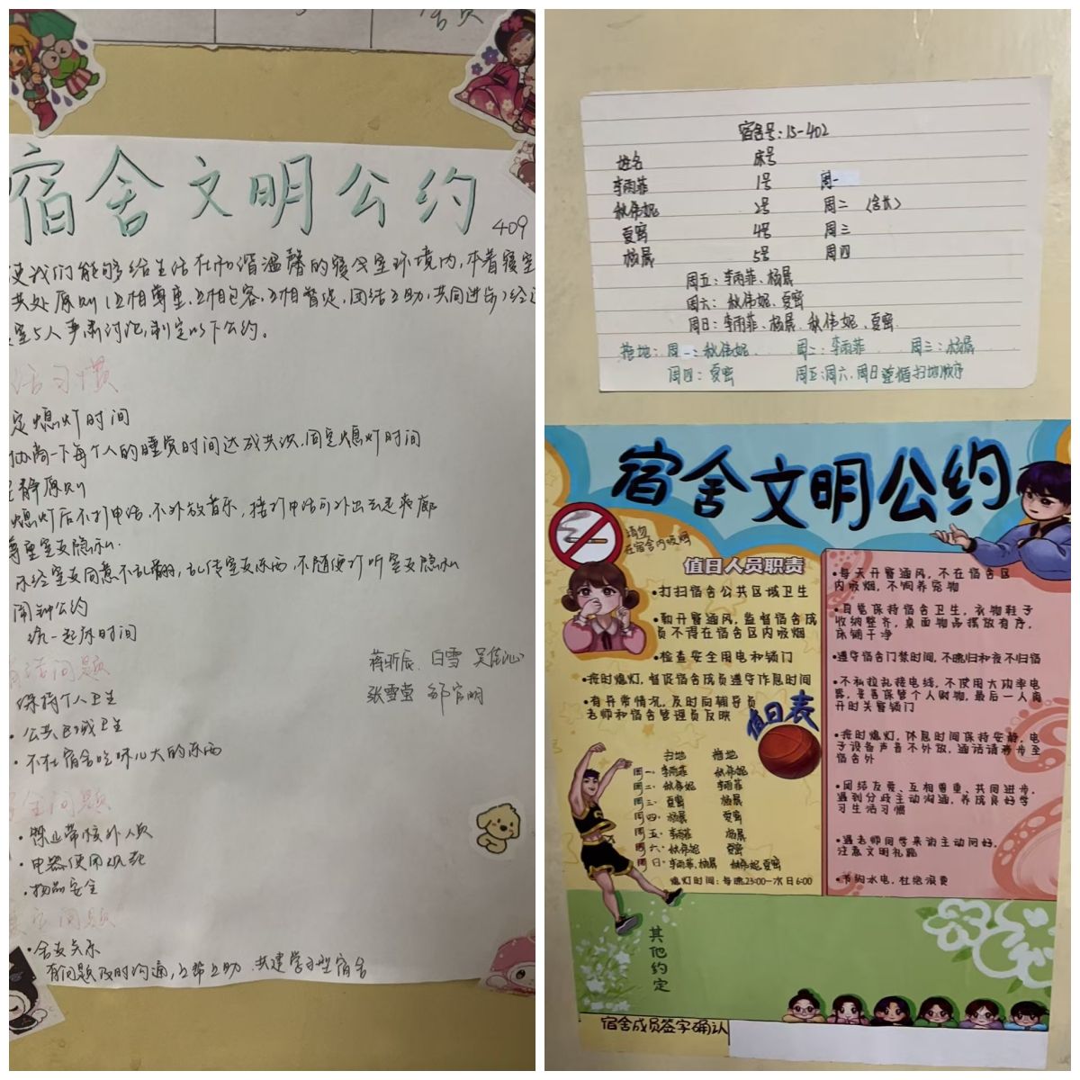 此次活动中,各宿舍成员积极参与,共同为打造文明、和谐、温馨的宿舍环境而努力。在宿舍公约制定过程中,大家充分发挥想象力和创造力,通过深入交流和讨论,结合宿舍实际情况,制定出了各具特色的宿舍公约。这些公约涵盖了作息时间、卫生管理、学习氛围营造、室友关系处理等多个方面,既体现了对规则的尊重,又展现了对彼此的关爱。
