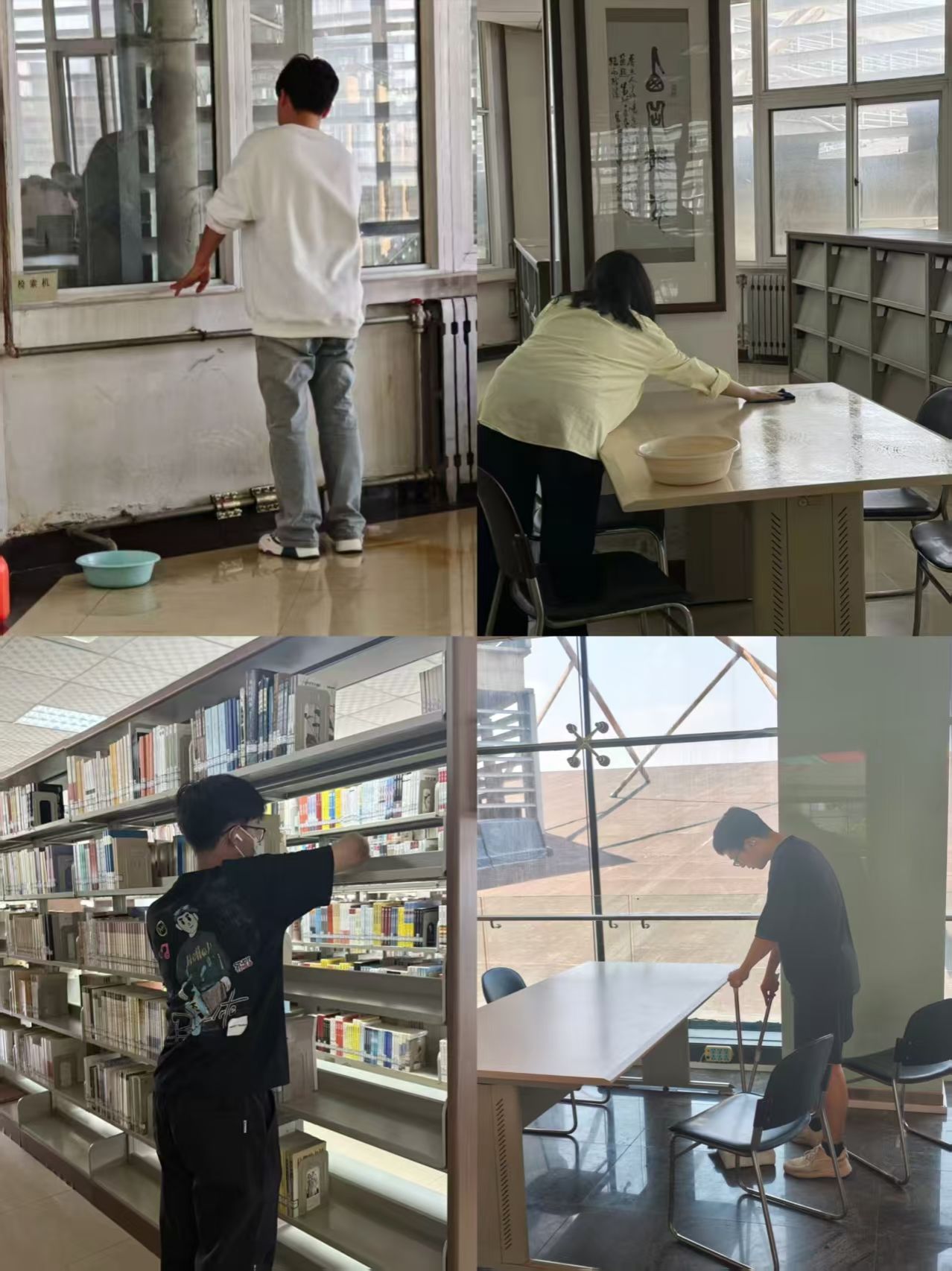 活动当天,参与同学热情饱满。大家合理分工后,迅速投入到清洁工作中。图书馆大厅里,同学们协作有序,清理图书馆的卫生。大家不怕脏、不怕累,专注投入,一丝不苟,展现了建工学子踏实肯干、团结协作的良好精神风貌。经过近一个小时的辛勤劳动,原本蒙尘的玻璃变得透亮,地面光洁如镜,桌椅摆放整齐,整个空间更加明亮、整洁、舒适。这为全校师生营造了一个更加宜人的学习、阅读与交流环境,也以实际行动践行了爱护校园、美化环境的承诺。