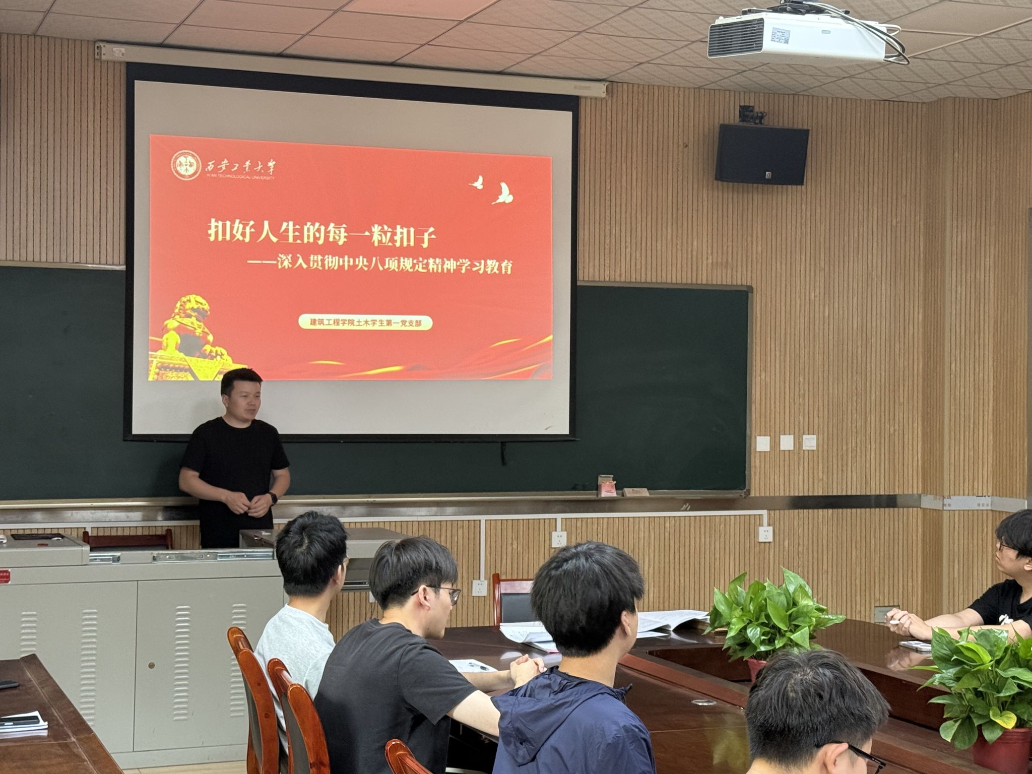 6月11日,857直播土木学生第一党支部组织开展深入贯彻中央八项规定精神学习教育专题党课。支部书记刘冬主讲,全体党员参加学习。