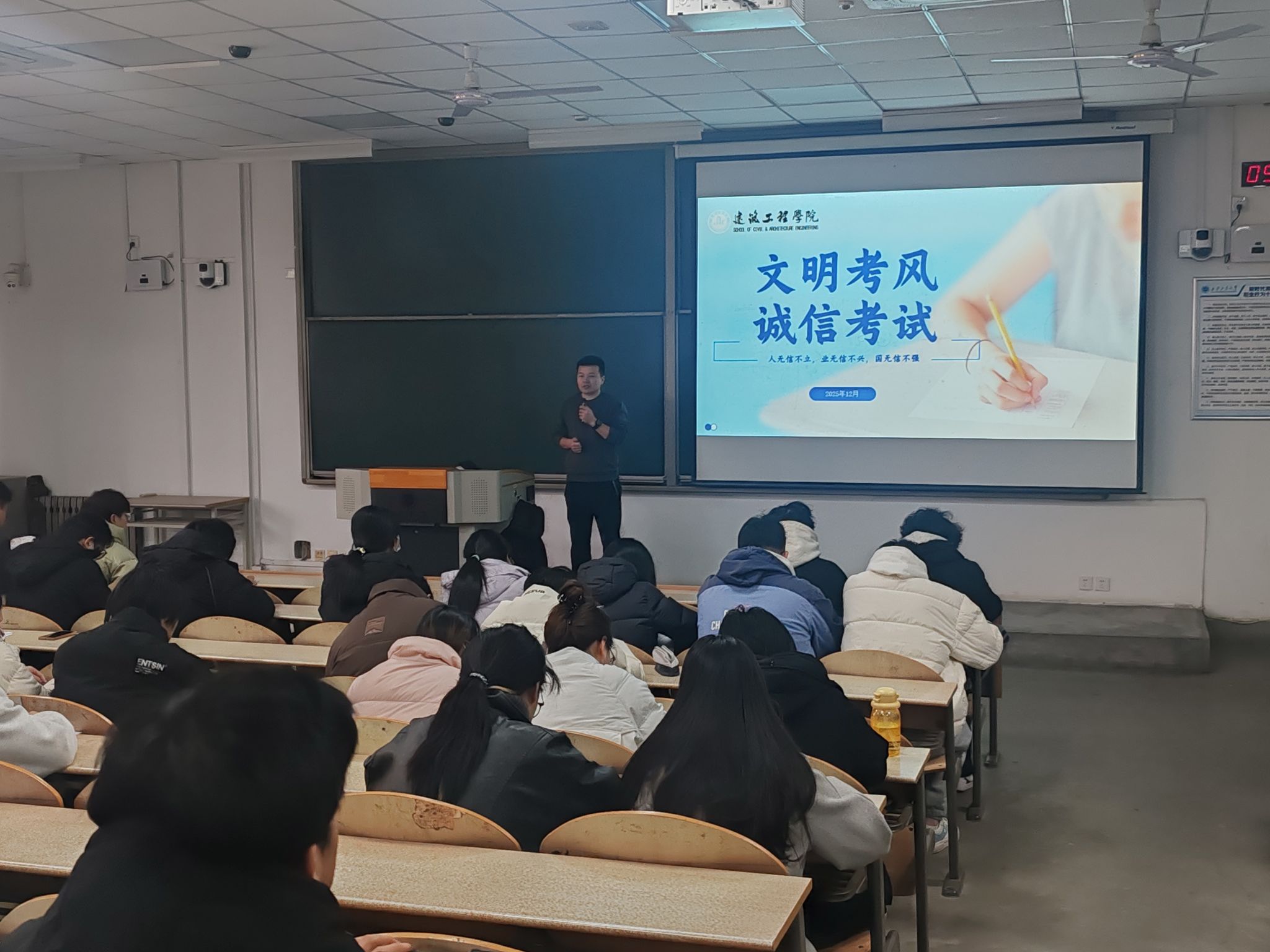 会议第一项,刘冬围绕“文明考风,诚信考试”主题展开宣讲。他结合学校考场管理规定,明确了“杜绝作弊、严守纪律”的考试要求,提醒同学们以诚信态度对待即将到来的期末考试,用真实成绩为半学期的学习交上答卷,考风考纪的重要性在细节强调中深入人心。