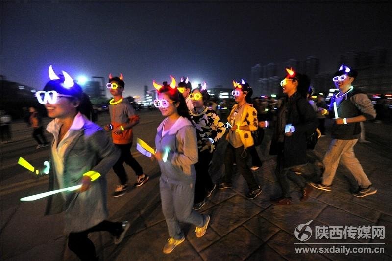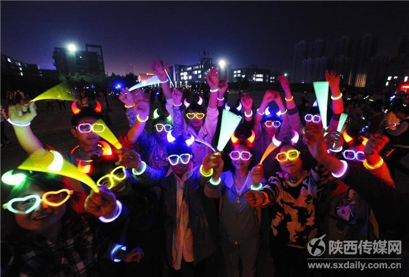 2015年4月14日晚,为庆祝校庆60周年,建工学院团委举办以“走出宿舍,拥抱青春,分享快乐”为主题的荧光夜跑活动在西安工业大学未央校区举行,1000多名大学生头手举荧光棒,头戴荧光牛角帽和荧光眼睛,齐声喊完口号后,组成的“荧光夜跑团”火力全开,健康出行。