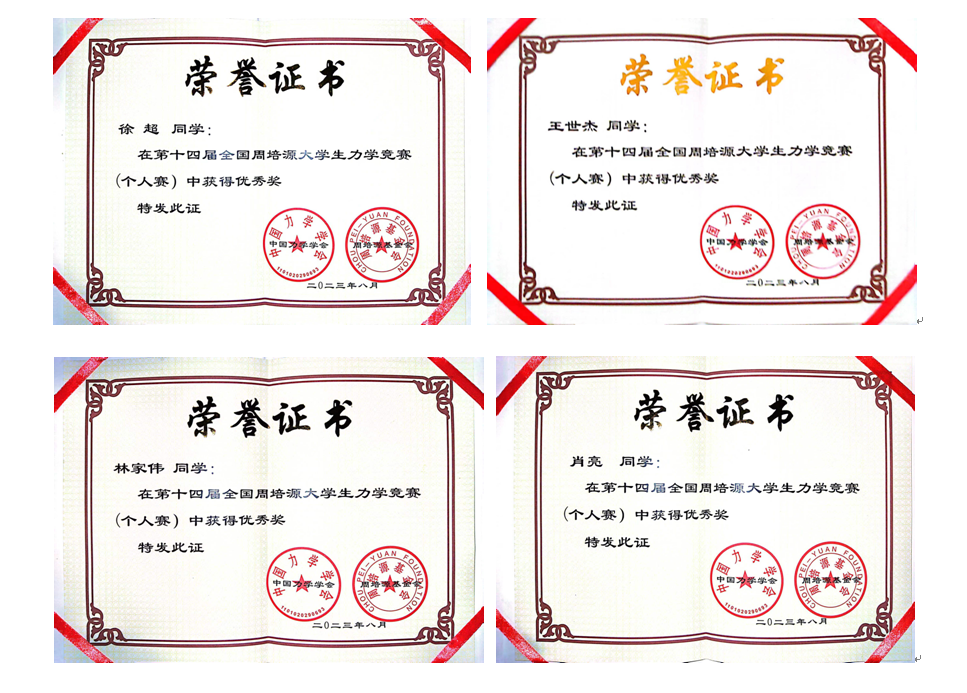 近日,第十四届全国周培源大学生力学竞赛(个人赛)获奖名单公布,我校徐超、王世杰、林家伟、肖亮四位同学荣获国家级个人赛优秀奖,取得我校2008年首次参赛以来国赛个人赛的历史最好成绩。