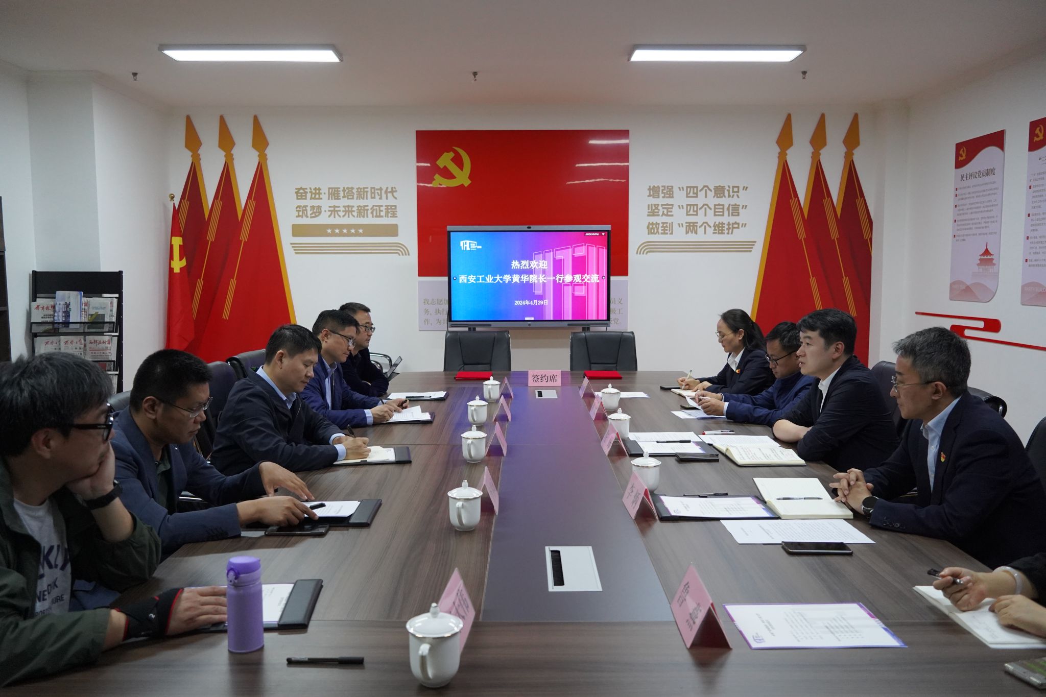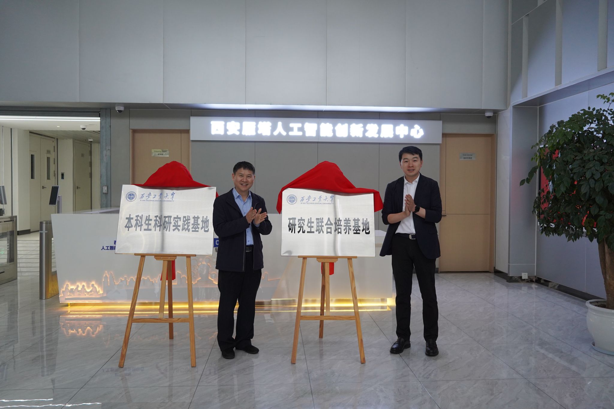 最后,集团领导陪同参观了西安雁塔人工智能创新发展中心,黄华院长和左腾董事长为西安工业大学本科生科研实践基地和研究生联合培养基地揭牌,听取了中心负责人的介绍,并表达了双方进一步合作发展的意愿。