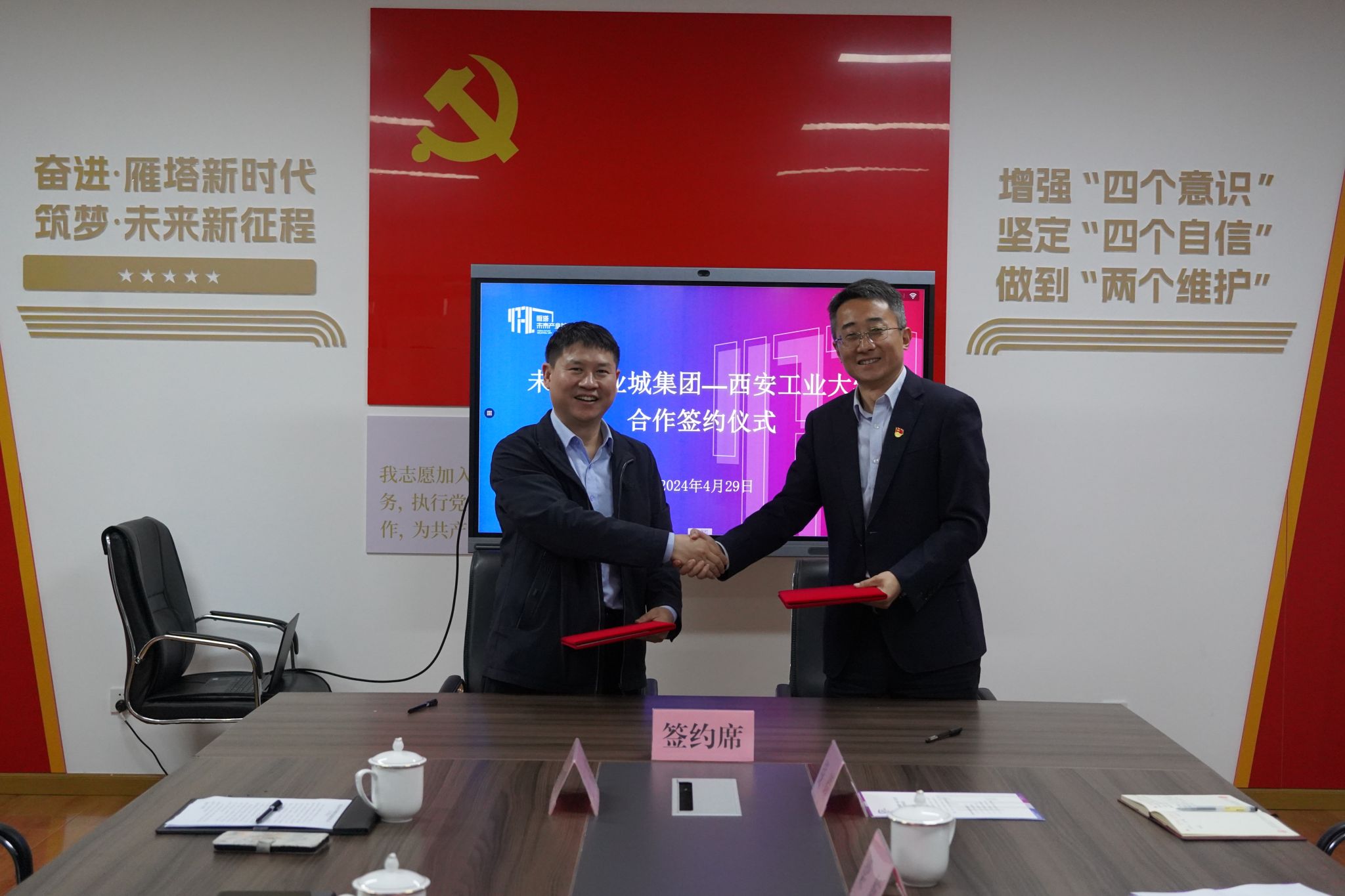 其次,黄华院长和李炳总工代表双方签署了《西安工业大学与西安未来产业城投资发展集团战略框架合作协议》,《西安工业大学本科生科研实践基地建设协议书》和《西安工业大学研究生联合培养基地合作协议书》三个合作协议。