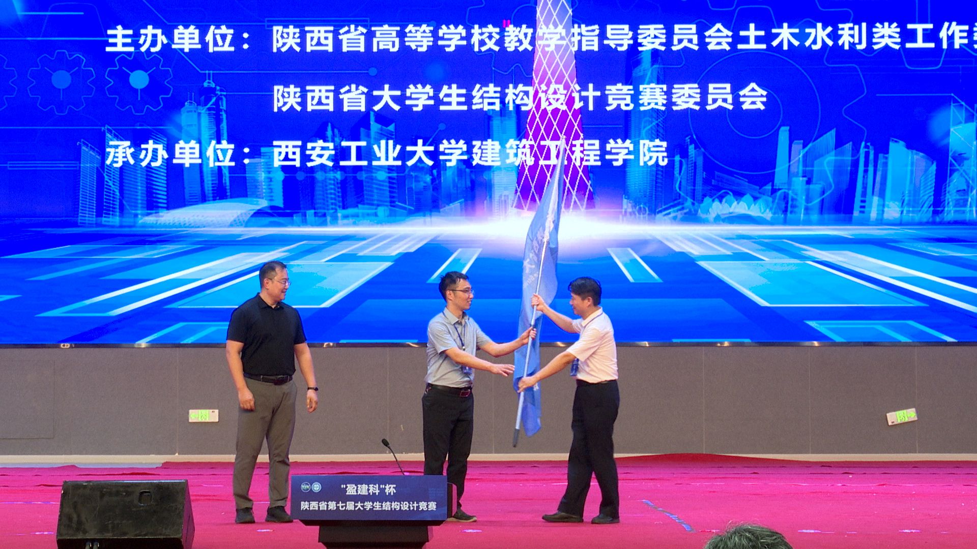 活动中还举行了全国大学生结构设计竞赛陕西省分区赛会旗交接仪式,西安工业大学将会旗移交给下一届赛事承办方西京学院。会旗交接仪式之后,西京学院谢明教授致辞。他讲到:大学生结构设计竞赛是由教育部、财政部首次联合发文批准的全国性9大学科竞赛资助项目之一,是土木建筑工程领域级别最高、规模最大、影响力最强、认可度最高的创新竞赛,西京学院能够承办此赛事深感光荣,也非常期待与各位嘉宾、专家、老师、同学们进行深入的交流与合作。至此,本次结构设计竞赛圆满结束。
