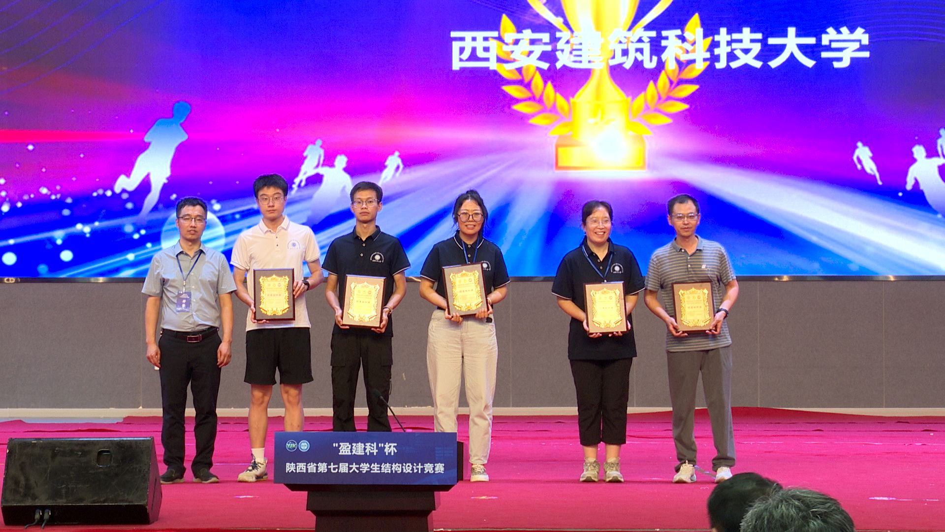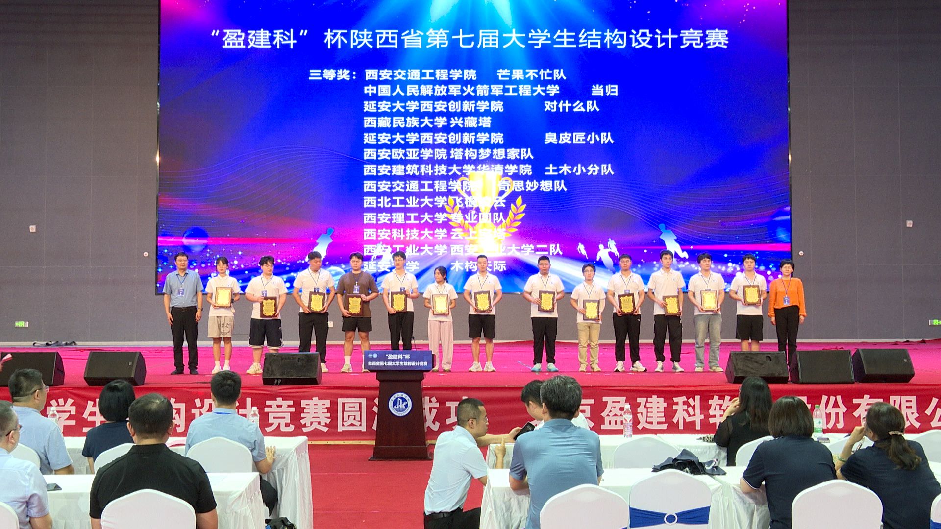 大会宣读了第十七届全国大学生结构设计竞赛陕西分赛区暨“盈建科杯”第七届陕西省大学生结构设计竞赛获奖名单,并举行了隆重的颁奖仪式。西安工业大学及西京学院等5所高校获“优秀组织奖”。根据理论方案、模型制作、陈述答辩、加载表现,以及竞赛专家委员会评审产生了各奖项,其中,西安交通大学荣获特等奖;西安工业大学、西安理工大学等7支参赛队伍荣获一等奖;西安建筑科技大学、西安石油大学等12支参赛队伍荣获二等奖;西安交通工程学院、中国人民解放军火箭军工程大学等13支参赛队伍荣获三等奖,榆林学院、西安科技大学高新学院等15支参赛队伍荣获优秀奖;陕西理工大学获评“最佳创意奖”;西安交通大学获评“最佳制作奖”。将有5支队伍代表陕西省参加第十七届全国大学生结构设计竞赛。