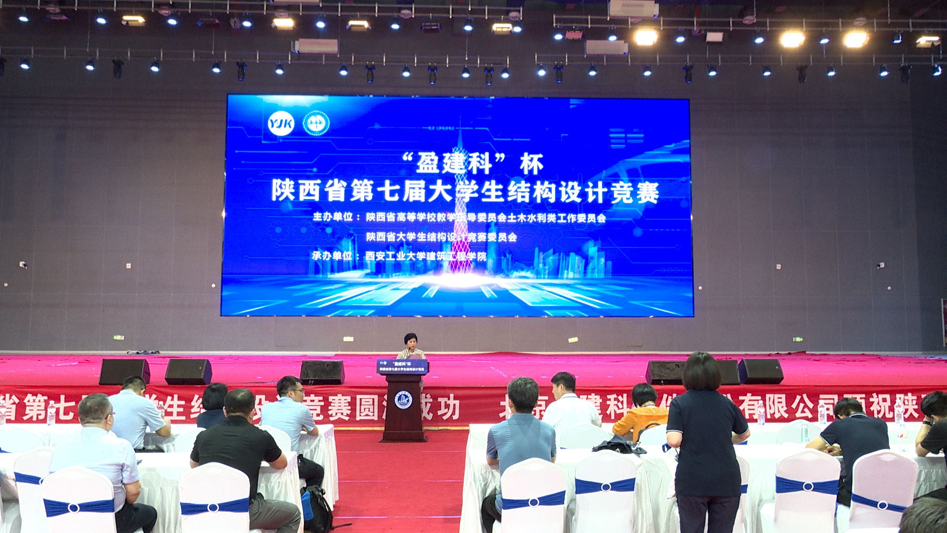 陕西省大学生结构设计竞赛专家委员会秘书长门进杰教授,西安工业大学本科生院院长郭永春教授,西安建筑科技大学教学质量监控与评估中心常务副主任兼教务处副处长钟炜辉教授,西安理工大学土木857直播院长赵钦教授,西京学院教务处处长谢明教授,西安交通大学人居学院副院长张硕英教授,西安理工大学土木857直播副院长郭宏超教授,西安科技大学建筑与土木工程学院副院长唐丽云教授,857直播院长黄华教授,以及220余名参赛师生出席闭幕式。大会由857直播党委书记刘慧萍主持。