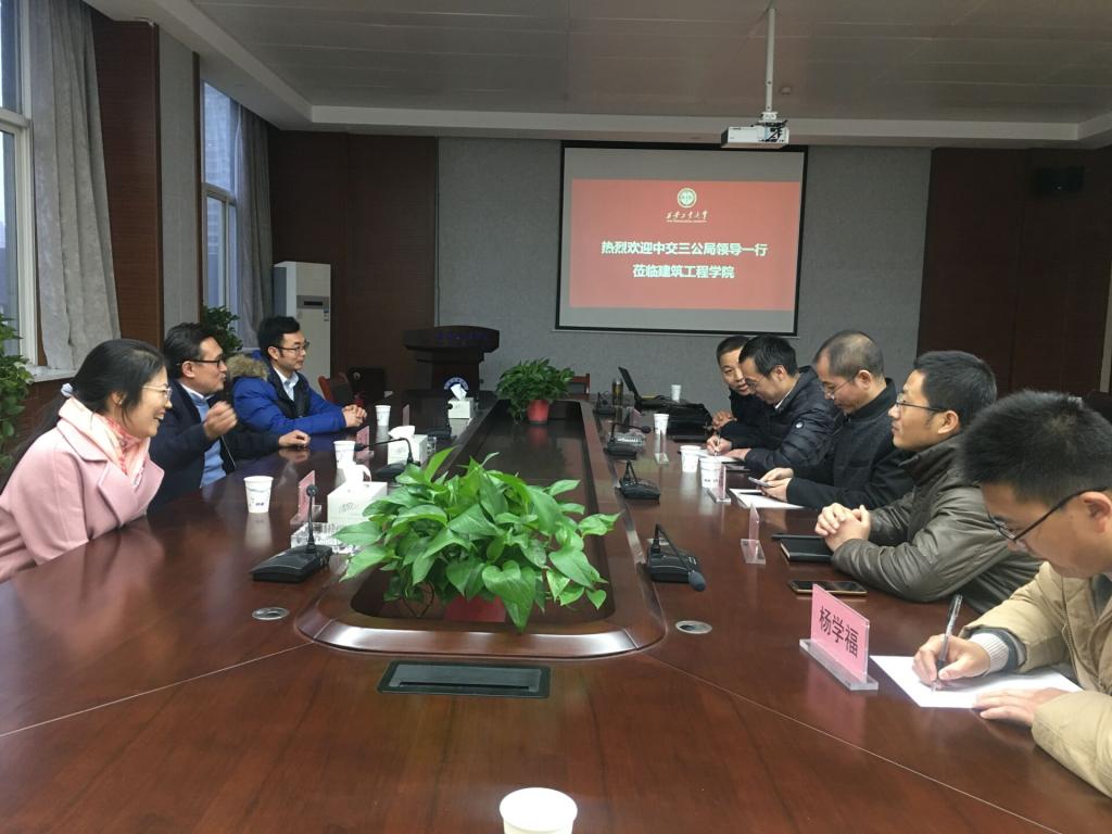 11月24日下午,中交第三公路工程局有限公司科学质量部王珏部长和高级主管侯瑞、孔小勇一行3人来我院进行校企合作对接。学院郭庆军副院长、张治宏副院长、李志军教授、刘金涛副教授,给排水科学与工程系杨学福、黄毅老师参加了会见。
