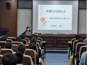 张英老师以“弄潮儿向涛头立——青年大学生为什么要入党”为主题讲授本次课程。首先,张老师向同学们提出“你为什么要入党”这一问题引发同学们思考,以《入党誓词歌》和作家高宝玉“我从心眼里想要入党”的故事向同学们诠释了一位共产党人加入中国共产党的决心;随后用疫情期间为了国家和人民勇于奋战在一线的共产党员事迹,向同学们展现了共产党人的初心和使命——为中国人民谋幸福,为中华民族谋复兴。