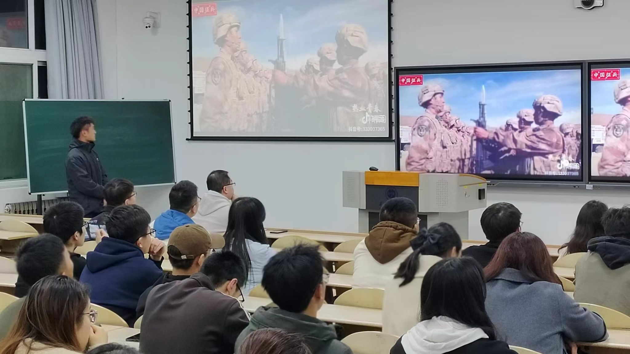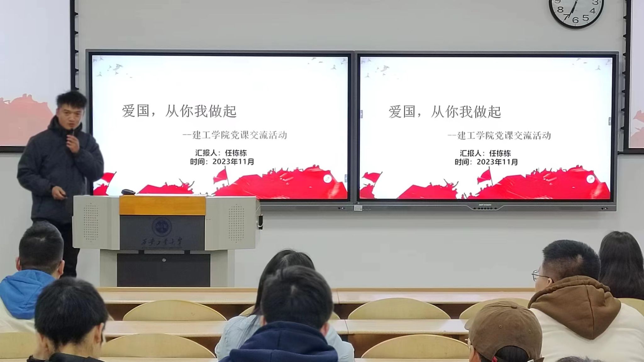任栋栋以为“爱国,从你我做起”为题,从自身参军的时光讲起,从为什么入党、参军、军营生活回顾和爱国主义行动三个方面进行了细致的讲解。首先任同学为大家讲述了自己的入党和参军的初心,强调爱国是作为一个党员最基本的要求,作为积极分子,应当时刻怀着一颗热忱的心来保卫祖国,然后他为学员播放了一段征兵入伍的视频,并结合视频为大家讲述了自己在军队的时光和收获。最后,任栋栋从八个方面为大家讲述了当代大学生如何弘扬爱国主义精神,践行爱国之志。