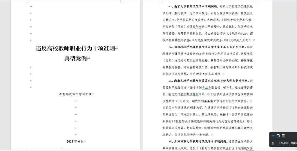 会上,大家集中学习了《违反高校教师职业行为十项准则典型案例》《新时代高校教师职业行为十项准则》《西安工业大学2023年师德集中学习材料及案例汇编》等文件和资料。与会成员联系思想和工作实际自查剖析,均表示要进一步提升政治站位、强化政治担当,经常性地进行自我检视,加强警觉、提高意识、提升本领、履职尽责。
